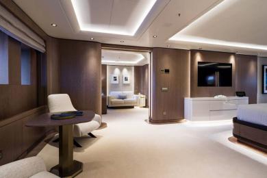 Built with a steel hull and aluminium superstructure, she offers greater on-board space and is more stable when at anchor thanks to her full-displacement hull. Powered by twin Caterpillar engines, she comfortably cruises at 16 knots, reaches a maximum speed of 18 knots with a range of up to 8,600 nautical miles from her 326,920 litre fuel tanks at cruising speed. An advanced stabilisation system on board reduces the side-to-side roll of the yacht and promises guests exceptional comfort levels at anchor or when underway.