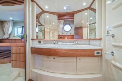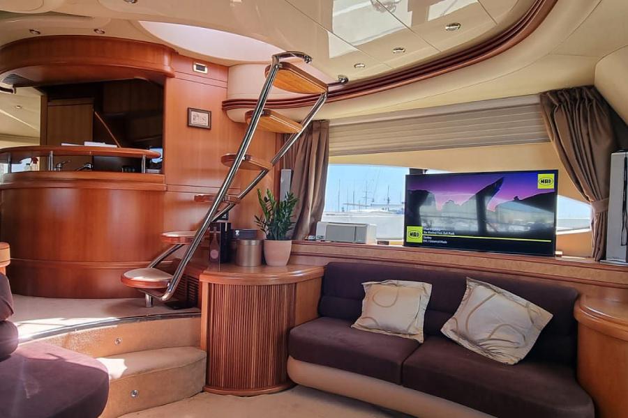 lts elegant interior consists of a large living room with two ·c· shaped alcadara sofas (one on each side) with large smart TV, then we have a comfortable dining room while on the other side it has a fully equipped kitchen with large fridge. lt have 4 cabins with it's own bathrooms.